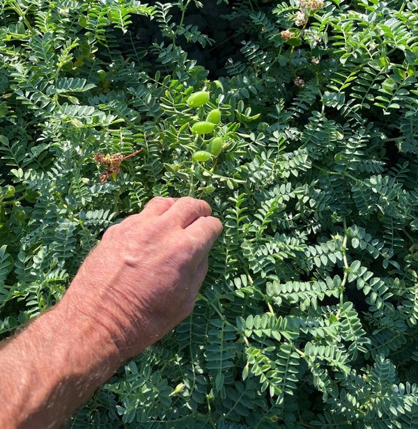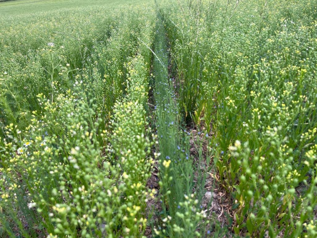 Damien pratique aussi les cultures associées. L’association lin-cameline favorise la biodiversité. La complémentarité de ces deux cultures augmente aussi la production. Autre exemple, des pois chiches sont plantés entre les rangs de lin. Chaque espèce est moins productive que cultivée seule mais la production globale est plus importante qu’une même parcelle en monoculture.